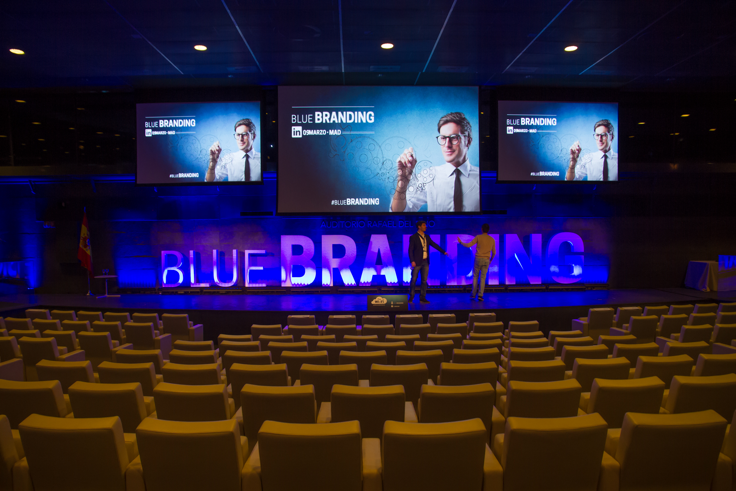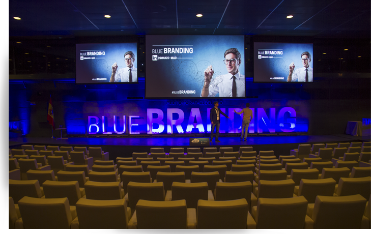 The key was to bring together LinkedIn’s various communication needs in one place. On the one hand, the brand sought to showcase potential candidates full of attitude and aptitude in the context of the event’s name, ‘BLUE BRANDING’, hence the blue backgrounds. Secondly, it was necessary to refer to the new international campaign, ‘You’re closer than you think‘. This was achieved using large-format panels on the stage and at the sides featuring references to these ‘inspiring’ candidates, and a more corporate theme on the back.