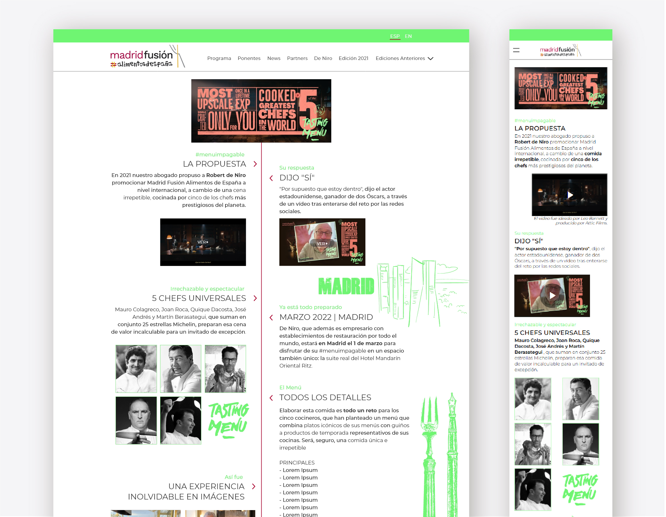 De Niro Campaign Page: Visual storytelling for a promotional campaign featuring Robert De Niro, integrating multimedia content (video, photography, and narrative copy) to enhance engagement and brand awareness.