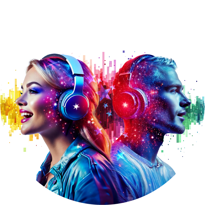 The podcasts stars are the main characters. They are shown dressed in a star-like halo to express that almost magical state in which content is generated (inspiration), and the idol or star status they have for their followers. All this is combined with sound waves and a technological style.