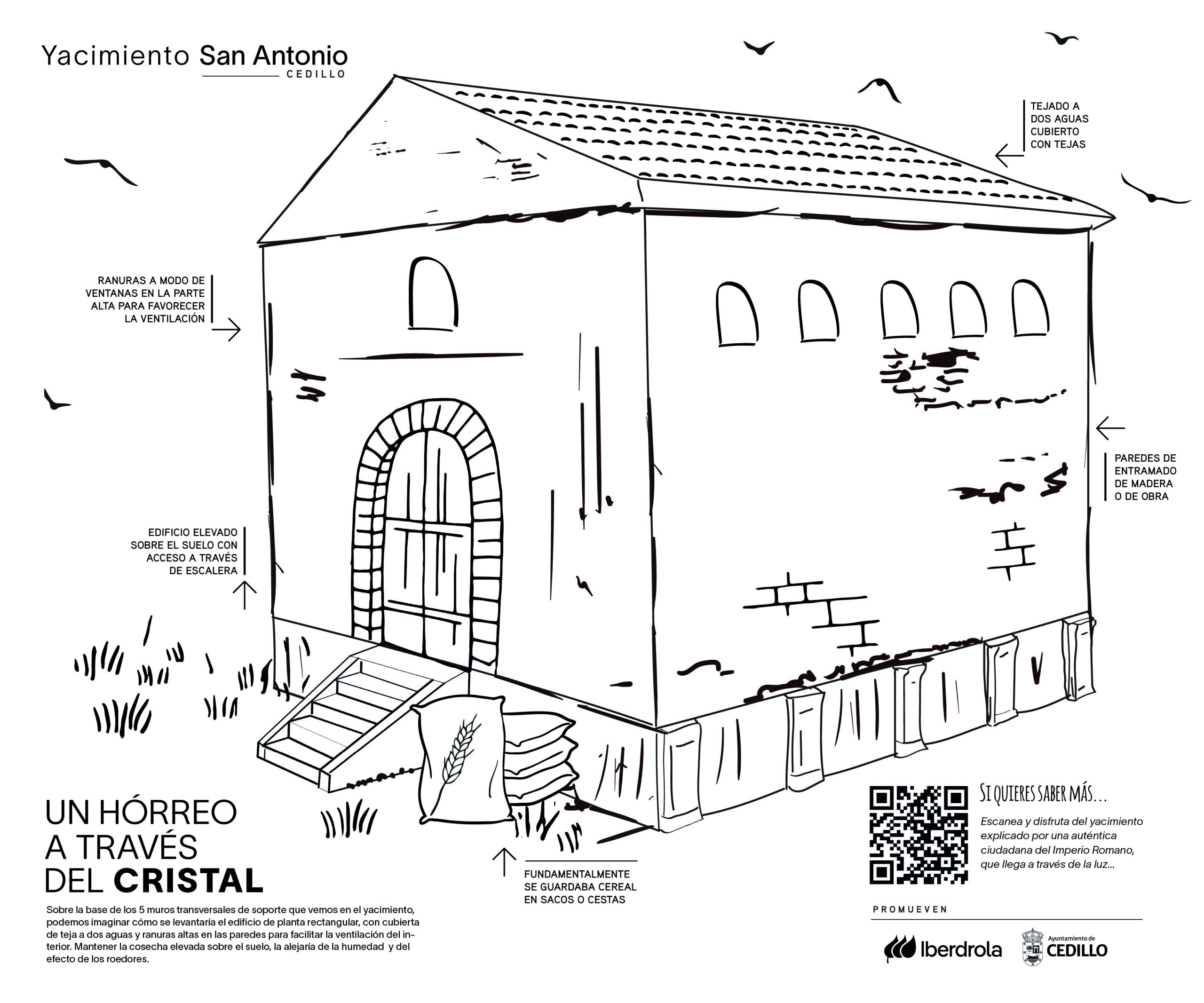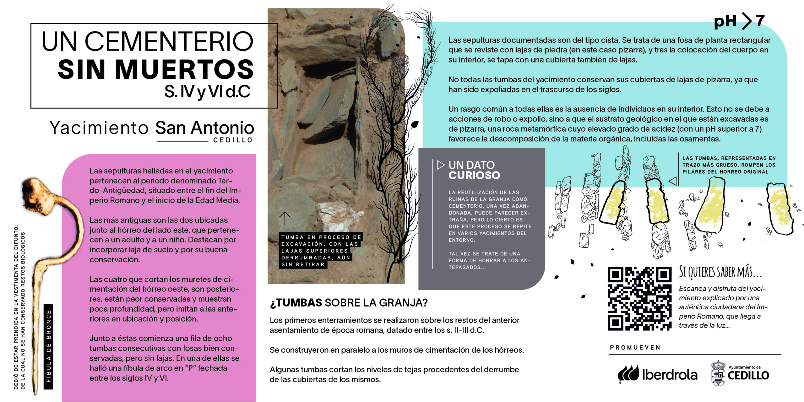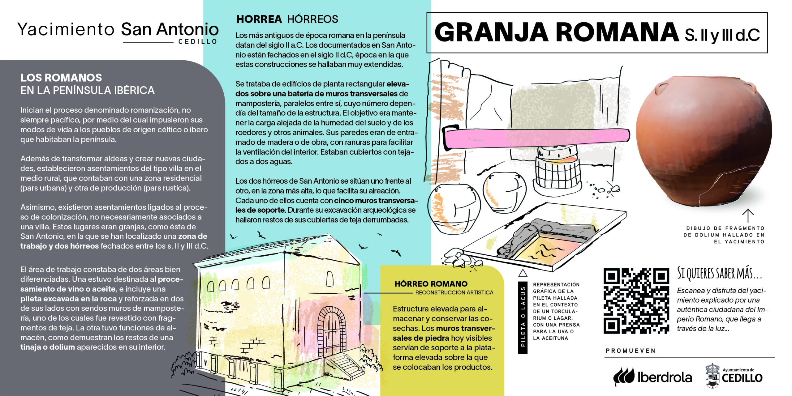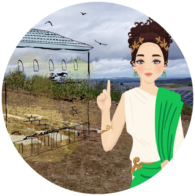 To showcase the San Antonio archaeological site in Cáceres, I designed information panels featuring QR codes that link to a video narrated by Claudia Tercia, an animated character representing an ancient Roman woman who lived in the area 1,500 years ago. In a light-hearted manner, she explains the different historical vicissitudes of the site and its inhabitants from Roman times to the present day. This is an educational way of explaining the origin of the San Antonio archaeological site, which was discovered during the construction of a photovoltaic plant in Cedillo (Cáceres), promoted by Iberdrola